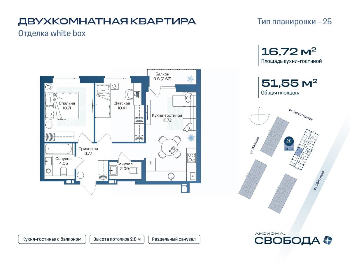 Продаётся 2-комнатная квартира в строящемся доме (Дом 1), срок сдачи: I-кв. 2029, общей площадью 51.55 кв.м., на 7 этаже. Новый жилой комплекс ''Аксиома. Свобода плюс'' от застройщика ''Аксиома'' расположен по адресу: Россия, Астрахань, Августовская улица