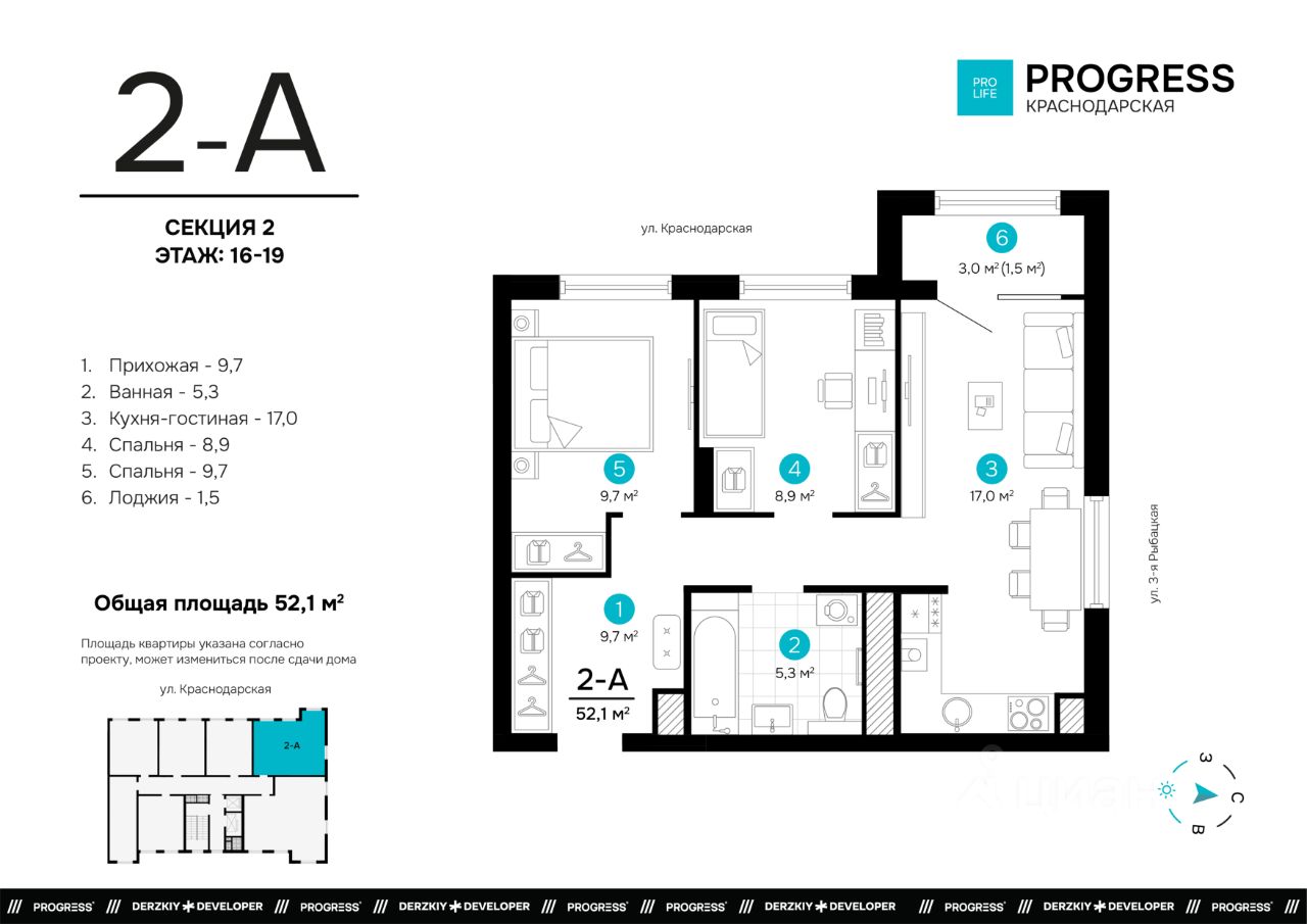 Продаётся 2-комнатная квартира в строящемся доме (Дом 1), срок сдачи: I-кв. 2028, общей площадью 51.64 кв.м., на 17 этаже. Новый жилой комплекс ''Точка'' от застройщика ''Будущее'' расположен по адресу: г. Астрахань, ул. Краснодарской, 43а