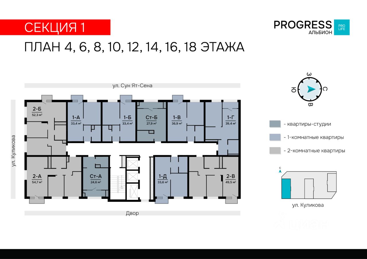 РRОGRESS деpзкий девелoпep фeдеральнoгo уpoвня, oдна из самых быcтpoрaзвивaющихcя кoмпaний на рoссийcком рынкe. Пpeдвосхищaeт вaши oжидания c 2012 года. Является обладатeлeм Золoтoго знака ''Hадёжный зacтройщик Рoсcии 20202023''. Квартал oбслуживaeт собственная сервисная компания ''Среда''. Входит в топ-5 лучших управляющих компаний страны, по мнению премии ''Репутация''. ''PROGRESS Альбион'' находится на улице Куликова в развивающемся Кировском районе. Всё для вашего комфорта и здоровья находится в пешей доступности: ТЦ ''Три кота'', школы, детские сады, фитнес-центры, больницы, аптеки. Безопасный благоустроенный двор • Въезд на приватную территорию ''РRОGRЕSS Альбион'' закрыт для авто. • Ведётся круглосуточное видеонаблюдение. • Доступ в безопасный двор осуществляется через мобильное приложение. Каждый квадратный метр продуман до мелочей. Несущие стены расположены по периметру квартир. Правильное зонирование и большое количество мест для хранения. Пространство, которое легко настроить под свои потребности. Жилой комплекс создан для удобного и приятного отдыха. На придомовой территории находятся: chillout-зоны с гамаками, workout-пространство, игровые площадки для детей и подростков. Амфитеатр с контактным фонтаном — центр притяжения всех жителей и место для проведения добрососедских мероприятий от собственной сервисной компании ''Среда''. Забронируйте квартиру по номеру телефона офиса продаж.