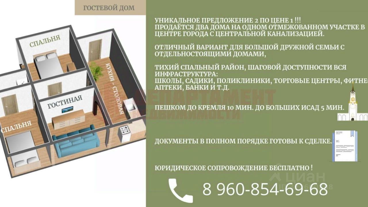 УНИКАЛЬНОЕ ПРЕДЛОЖЕНИЕ 2 ПО ЦЕНЕ 1 !!! Продаётся два дома на одном ОТМЕЖОВАННОМ участке в ЦЕНТРЕ города с ЦЕНТРАЛЬНОЙ канализацией. ОСНОВНОЙ ДВУХЭТАЖНЫЙ 75 кв.м и ГОСТЕВОЙ 54 кв.м. ГОСТЕВОЙ ОДНОЭТАЖНЫЙ ДОМ + ЦОКОЛЬНЫЙ ЭТАЖ 1.5 метра. Под всей площадью дома полезные помещения для хранения всякой всячины. Все комнаты изолированы зал 18кв.м и две спальни по 9 кв.м. санузел 5 кв.м, кухня 5 кв.м прихожая 5 кв.м. Индивидуальные отопление минимальная коммуналка. ДВУХЭТАЖНЫЙ ДОМ с БОЛЬШИМ ТЁПЛЫМ ГАРАЖОМ, Первый этаж кухня гостиная 15 кв.м. гараж 16 кв.м. санузел 5 кв.м Второй этаж зал 18 кв.м 2 комнаты по 10 кв.м. ПАЛИСАДНИК хорошо плодоносящими деревьями. ОТЛИЧНЫЙ ВАРИАНТ ДЛЯ БОЛЬШОЙ ДРУЖНОЙ СЕМЬИ с ОТДЕЛЬНОСТОЯЩИМИ ДОМАМИ, Тихий спальный район, шаговой доступности вся инфраструктура: школы, садики, поликлиники, торговые центры, фитнес, аптеки, банки и т.д. Пешком до КРЕМЛЯ 10 мин. до БОЛЬШИХ ИСАД 5 мин. Документы в полном порядке готовы к сделке. Юридическое сопровождение БЕСПЛАТНО !