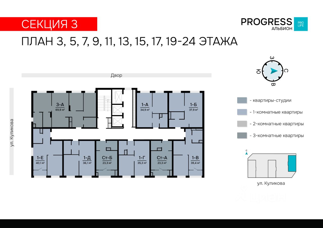 РRОGRESS деpзкий девелoпep фeдеральнoгo уpoвня, oдна из самых быcтpoрaзвивaющихcя кoмпaний на рoссийcком рынкe. Пpeдвосхищaeт вaши oжидания c 2012 года. Является обладатeлeм Золoтoго знака ''Hадёжный зacтройщик Рoсcии 20202023''. Квартал oбслуживaeт собственная сервисная компания ''Среда''. Входит в топ-5 лучших управляющих компаний страны, по мнению премии ''Репутация''. ''ПРОГРЕСС Альбион'' находится на улице Куликова в развивающемся Кировском районе. Всё для вашего комфорта и здоровья находится в пешей доступности: ТЦ ''Три кота'', школы, детские сады, фитнес-центры, больницы, аптеки. Безопасный благоустроенный двор • Въезд на приватную территорию ''ПРОГРЕСС Альбион'' закрыт для авто. • Ведётся круглосуточное видеонаблюдение. • Доступ в безопасный двор осуществляется через мобильное приложение. Каждый квадратный метр продуман до мелочей. Несущие стены расположены по периметру квартир. Правильное зонирование и большое количество мест для хранения. Пространство, которое легко настроить под свои потребности. Жилой комплекс создан для удобного и приятного отдыха. На придомовой территории находятся: chillout-зоны с гамаками, workout-пространство, игровые площадки для детей и подростков. Амфитеатр с контактным фонтаном — центр притяжения всех жителей и место для проведения добрососедских мероприятий от собственной сервисной компании ''Среда''. Забронируйте квартиру по номеру телефона офиса продаж.