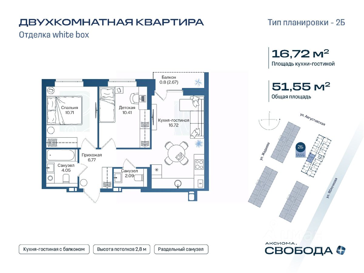 Продаётся 2-комнатная квартира в строящемся доме (Дом 1), срок сдачи: I-кв. 2029, общей площадью 51.55 кв.м., на 16 этаже. Новый жилой комплекс ''Аксиома. Свобода плюс'' от застройщика ''Аксиома'' расположен по адресу: Россия, Астрахань, Августовская улица