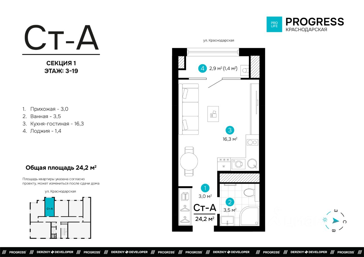 Продаётся 1-комнатная квартира в строящемся доме (Дом 1), срок сдачи: I-кв. 2028, общей площадью 35.29 кв.м., на 4 этаже. Новый жилой комплекс ''Точка'' от застройщика ''Будущее'' расположен по адресу: г. Астрахань, ул. Краснодарской, 43а