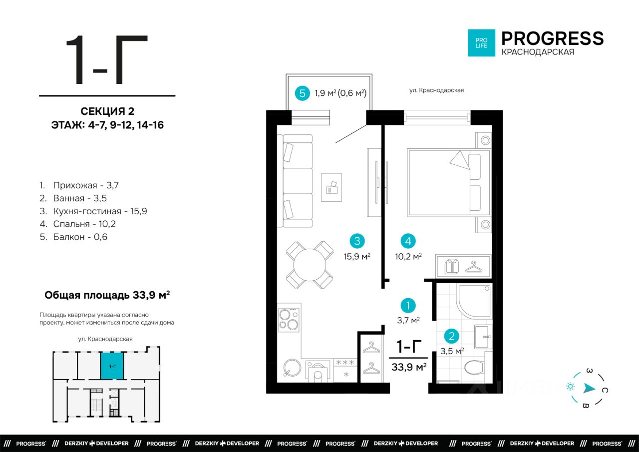 Продаётся 1-комнатная квартира в строящемся доме (Дом 1), срок сдачи: I-кв. 2028, общей площадью 33.92 кв.м., на 4 этаже. Новый жилой комплекс ''Точка'' от застройщика ''Будущее'' расположен по адресу: г. Астрахань, ул. Краснодарской, 43а