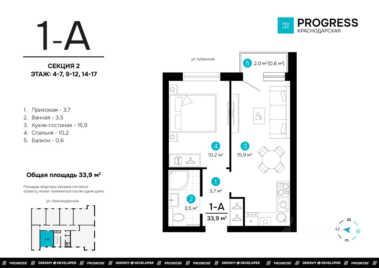Продаётся 1-комнатная квартира в строящемся доме (Дом 1), срок сдачи: I-кв. 2028, общей площадью 33.92 кв.м., на 11 этаже. Новый жилой комплекс ''Точка'' от застройщика ''Будущее'' расположен по адресу: г. Астрахань, ул. Краснодарской, 43а