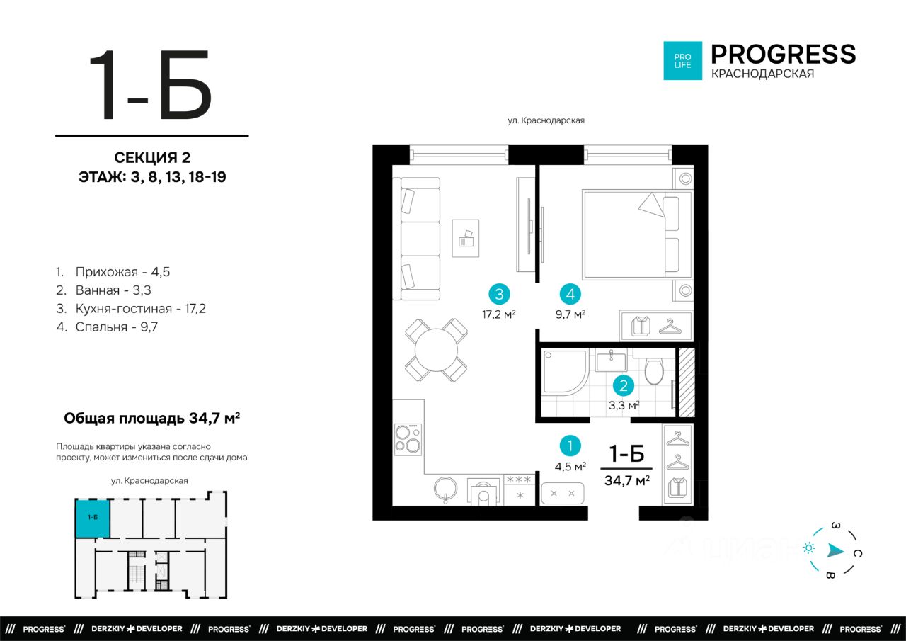 Продаётся 1-комнатная квартира в строящемся доме (Дом 1), срок сдачи: I-кв. 2028, общей площадью 34.7 кв.м., на 13 этаже. Новый жилой комплекс ''Точка'' от застройщика ''Будущее'' расположен по адресу: г. Астрахань, ул. Краснодарской, 43а