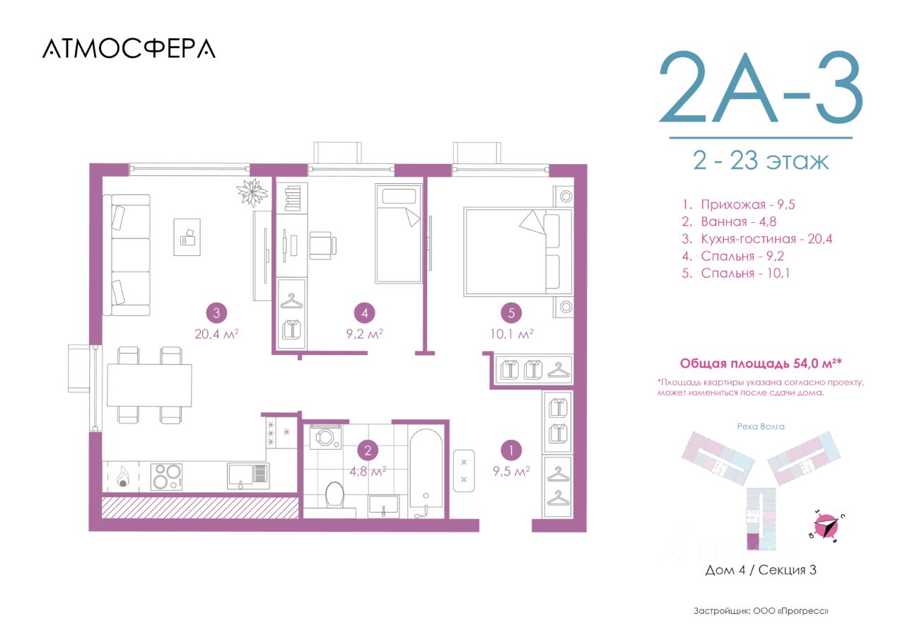 Продажа от застройщика PROGRESS — дерзкий девелопер федерального уровня, одна из самых быстроразвивающихся компаний на российском рынке. Предвосхищает ваши ожидания с 2012 года. Каждый проект PROGRESS оригинален, отличается дизайном, архитектурой и ландшафтными решениями. Является обладателем Золотого знака ''Надёжный застройщик России — 20202023''. Комплекс обслуживает собственная сервисная компания ''Среда''. Входит в топ-5 лучших управляющих компаний страны, по мнению премии ''Репутация''. Живи в Атмосфере Жилой комплекс ''Атмосфера'' — уникальный проект линейки PRO MAX. Многоуровневая закрытая дворовая территория, авторская концепция холлов, сервис на уровне пятизвёздочного отеля. Уединённая локация между двумя водными пространствами — рекой Волгой и Приволжским затоном. На безопасной приватной дворовой территории ведётся круглосуточное видеонаблюдение. Для самых маленьких здесь оборудован детский игровой центр — кидс клаб, а для взрослых — премиальная кофейня с чарующим видом на Волгу. ''Атмосфера'' выводит понятие ''комфорт'' на совершенно иной уровень. Каждая деталь говорит о стремлении к совершенству. ''Атмосфера'' в цифрах: 4 дома с собственной уникальной и интерактивной дворовой территорией прямо на берегу реки Волги 1 приватный двор размером с городской парк 7 спортивных площадок 6 пространств для отдыха 5 детских площадок, включающих в себя интерактивный ручеёк и автодром 10 минут от исторической части города Почувствуй роскошный сервис • Собственная сервисная компания ''Среда'' поможет не беспокоиться о бытовых проблемах. • Персональное мобильное приложение ''Среда'', в котором можно просматривать новости и объявления, оплачивать коммунальные счета, получить доступ во двор и к камерам видеонаблюдения. • Консьерж-сервис. • Бесплатный wi-fi на всей территории комплекса. Квартира с предчистовой отделкой включает в себя: — Межквартирные стены, выровненные по маякам. — Межкомнатные стены из гипсовых пазогребневых плит, не требующие дополнительного выравнивания. — Откосы входной двери и оконных проёмов, реализованные и подготовленные к финишной отделке. — Напольное покрытие без стяжки. — Электрическая проводка по потолку. — Подводка инженерных коммуникаций к местам установки сантехнических приборов. Способы приобретения квартиры: С помощью материнского капитала В ипотеку Забронируйте квартиру по номеру телефона офиса продаж. Выведи свою жизнь на новый уровень. Живи в Атмосфере.