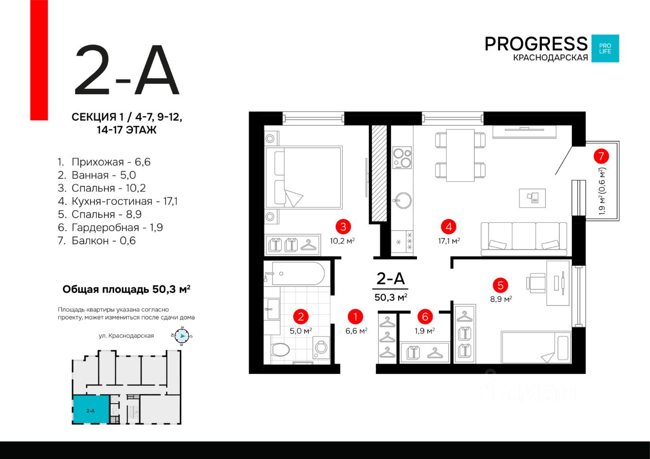 Продаётся 2-комнатная квартира в строящемся доме (Дом 1), срок сдачи: I-кв. 2028, общей площадью 50.3 кв.м., на 6 этаже. Новый жилой комплекс ''Точка'' от застройщика ''Будущее'' расположен по адресу: г. Астрахань, ул. Краснодарской, 43а