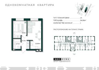 Продаётся 1-комнатная квартира в строящемся доме (Дом 1), срок сдачи: I-кв. 2026, общей площадью 35.18 кв.м., на 6 этаже.