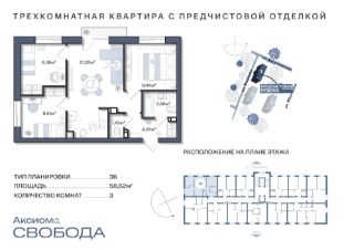 Продаётся 3-комнатная квартира в строящемся доме (Дом 2), срок сдачи: II-кв. 2026, общей площадью 58.54 кв.м., на 9 этаже. Свобода духа, свобода выбора, свобода творчества! Место, где вы точно станете автором своей жизни! Аксиома. Свобода - новый проект с современным подчерком, для тех, кто стремится жить со вкусом и по своим правилам! Это место для тех, кто ценит комфорт, но одновременно желает находиться в потоке современной жизни. Проект комфорт-класса расположен на улице Августовская 70. Это живописный район вблизи реки и развитой производственно-торговой части города с крупной транспортной развязкой. В шаговой доступности вся необходимая инфраструктура: садики, школы, спортивные и медицинские учреждения, торговый центр.