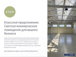 Классное предложение: светлое коммерческое помещение для вашего бизнесаИщете пространство, где бизнесу будет удобно и перспективно?Предлагаем просторное помещение свободного назначения на первом этаже в городском пространстве Территория АЗХО. Гибкие условия:Мы осваиваем большие площади, поэтому вы можете арендовать как всё помещение целиком, так и его часть.Стоимость аренды зависит от выбранной площади и качества ремонта. Локация: Спальный район с активной застройкой новыми ЖК, шаговая доступность для жителей и удобный подъезд даже для фур, Заезд на Территорию АЗХО с оживлённой улицу с потоком от 5 000 машин в день. Преимущества помещения: свободная планировка и возможность зонирования под ваши задачи, панорамные окна и световые фонари — максимум естественного света, несколько технических входов для удобной логистики, только первый этаж, удобный вход, отличная видимость фасада. Инфраструктура: всегда доступная просторная парковка для клиентов, окружение из торговых, спортивных и образовательных центров — формируем общий поток без конкуренции, часть активно развивающегося бизнес-кластера: синергия арендаторов даёт новых клиентов и партнёров.Мы ищем надёжных долгосрочных резидентов, готовых расти вместе с нами.Добро пожаловать на Территорию АЗХО — здесь бизнесу удобно, а людям приятно приходить.
