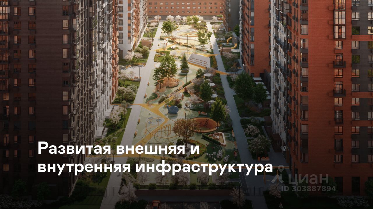 Благоустроенный двор-парк площадью 10 000 кв.м.: • Игровые площадки для детей всех возрастов и летний кинотеатр. • Отсутствие машин во дворе для безопасности детей и взрослых. • Подземный паркинг и большая наружная парковка. • Зоны воркаута. • Фонтан, амфитеатр, лабиринт и автогородок. • Отдельно выделенный участок для выгула питомцев за пределами двора.