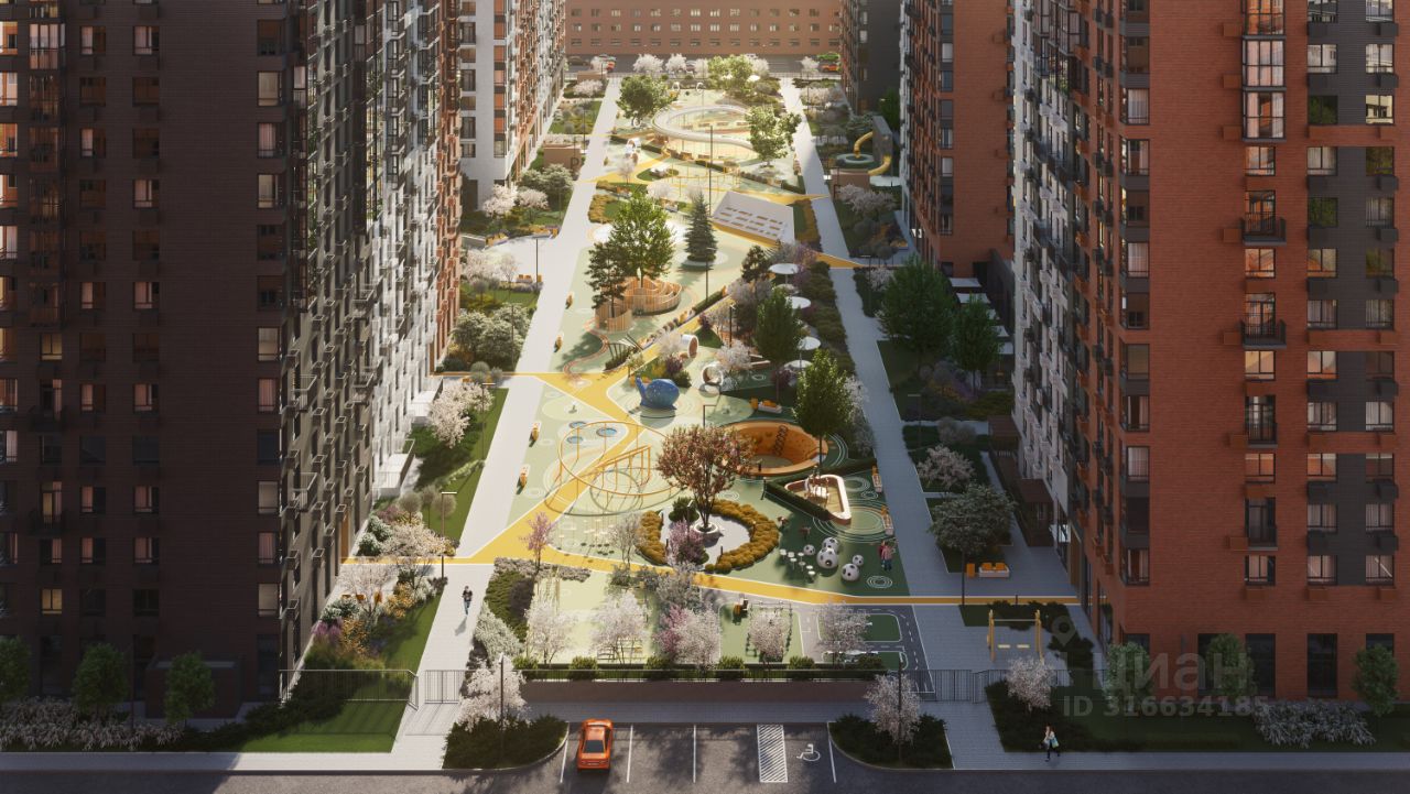 Благоустроенный двор-парк площадью 10 000 кв.м.: • Игровые площадки для детей всех возрастов и летний кинотеатр. • Отсутствие машин во дворе для безопасности детей и взрослых. • Подземный паркинг и большая наружная парковка. • Зоны воркаута. • Фонтан, амфитеатр, лабиринт и автогородок. • Отдельно выделенный участок для выгула питомцев за пределами двора.