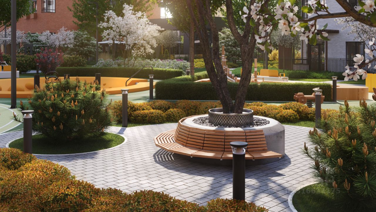 Благоустроенный двор-парк площадью 10 000 кв.м.: • Игровые площадки для детей всех возрастов и летний кинотеатр. • Отсутствие машин во дворе для безопасности детей и взрослых. • Подземный паркинг и большая наружная парковка. • Зоны воркаута. • Фонтан, амфитеатр, лабиринт и автогородок. • Отдельно выделенный участок для выгула питомцев за пределами двора.