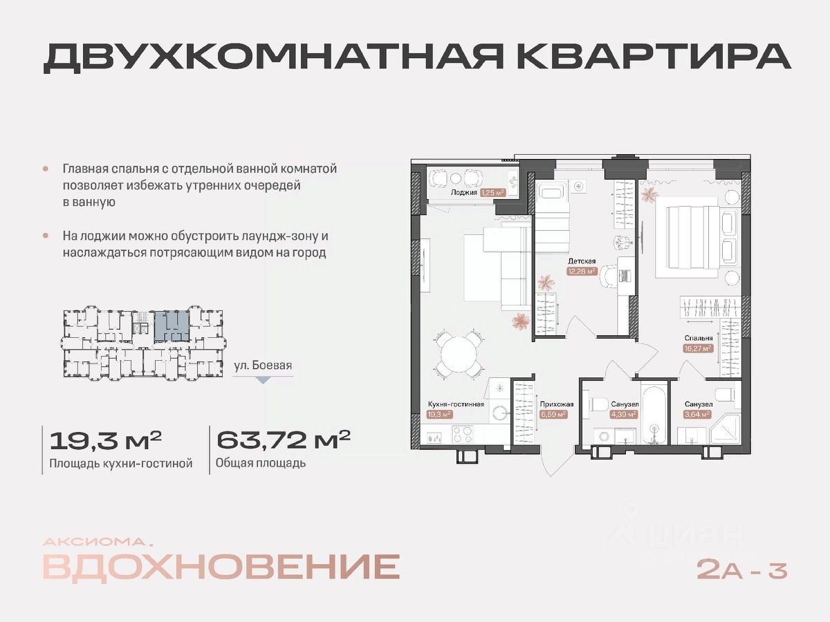 Продаётся 2-комнатная квартира в строящемся доме (Дом 50А), срок сдачи: IV-кв. 2027, общей площадью 63.72 кв.м., на 3 этаже. Новый жилой комплекс ''Аксиома.Вдохновение'' от застройщика ''Аксиома'' расположен по адресу: Астрахань, ул., Боевая, 50А