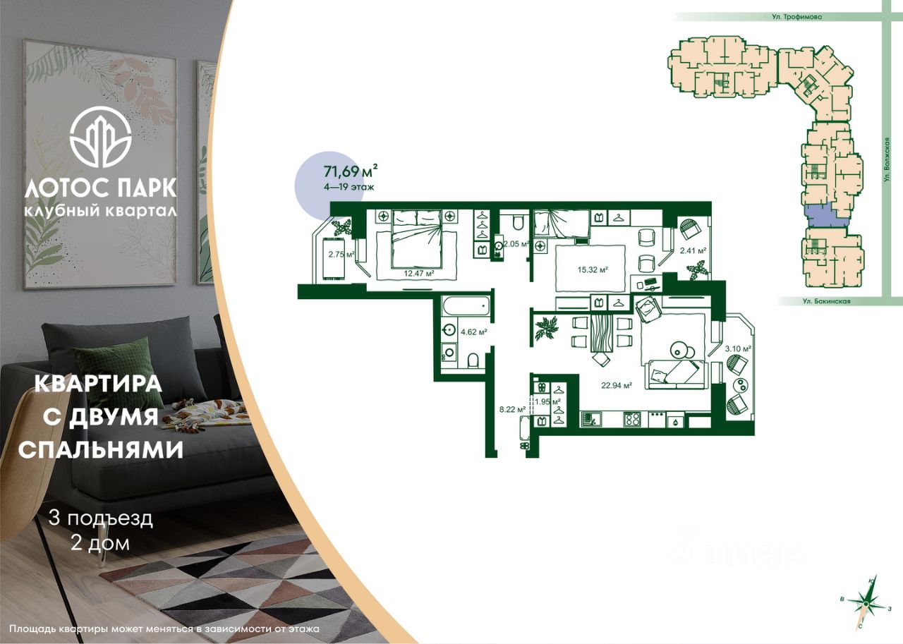 Продаётся 2-комнатная квартира в строящемся доме (Дом 1), срок сдачи: II-кв. 2026, общей площадью 71.65 кв.м., на 16 этаже.