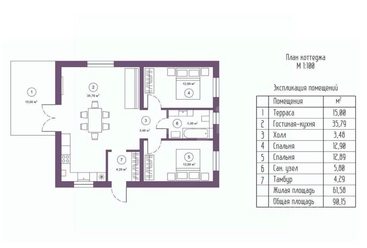 Дом 90кв.м одноэтажный с двумя спальнями и кухней-гостинной. С кухни выход на просторную террасу. Дом расположен на земельном участке 470 кв.м. Ограждение по периметру из металлопрофиля, с фасадной стороны - кирпичные колонны+металлопрофиль, калитка и распашные ворота.