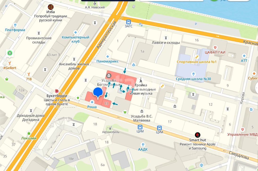 Высокий пешеходный и автомобильный трафик обеспечивает постоянный поток потенциальных клиентов. Объект имеет отдельный вход, земля в собственности, что исключает дополнительные юридические сложности. Район отличается насыщенной инфраструктурой: в непосредственной близости находятся рестораны, кафе, бары, кальянные, барбершопы и другие заведения, формирующие деловую и развлекательную среду. В нескольких минутах ходьбы — набережная Волги и Астраханский Кремль, что делает локацию особенно привлекательной для туристического, гостиничного и ресторанного бизнеса.