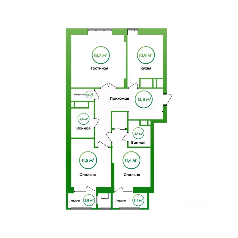Площадь лоджий — 2,8 м² и 4,4 м². Их можно оборудовать как места отдыха или как рабочее пространство. В квартире расположены два санузла площадью 3,4 м² и 4,5 м². Это позволит всем членам семьи забыть о суете во время утренних сборов. Вы сможете распределить детей на утренние процедуры, и сами спокойно умыться и собраться на работу.
