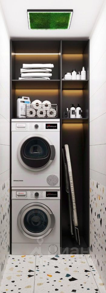В квартире предусмотрено прачечное помещение площадью 1,8 м², что позволит установить все необходимое для стирки и сушки белья в отдельную комнату.