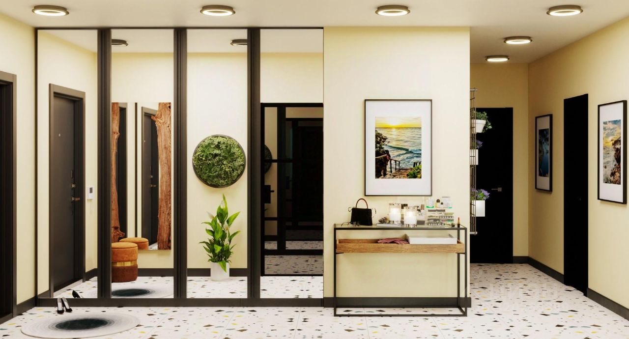 Просторная прихожая площадью 13,8 м² позволит разместить всю необходимую для входной зоны мебель, аксессуары и предметы интерьера.