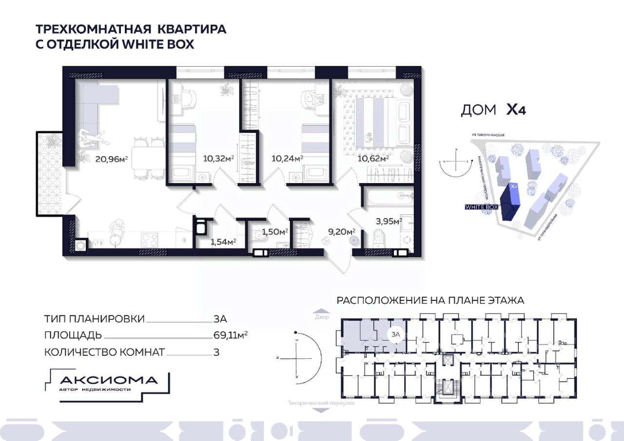 Продаётся 3-комнатная квартира в строящемся доме (Дом 4), срок сдачи: IV-кв. 2026, общей площадью 69.11 кв.м., на 2 этаже. Аксиома на Тихореченской