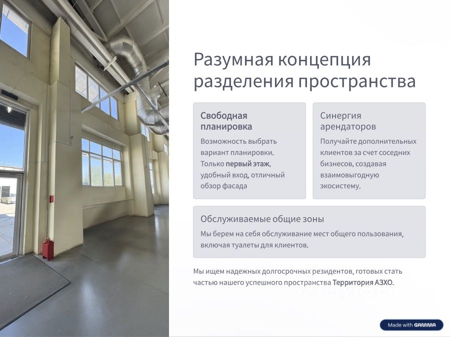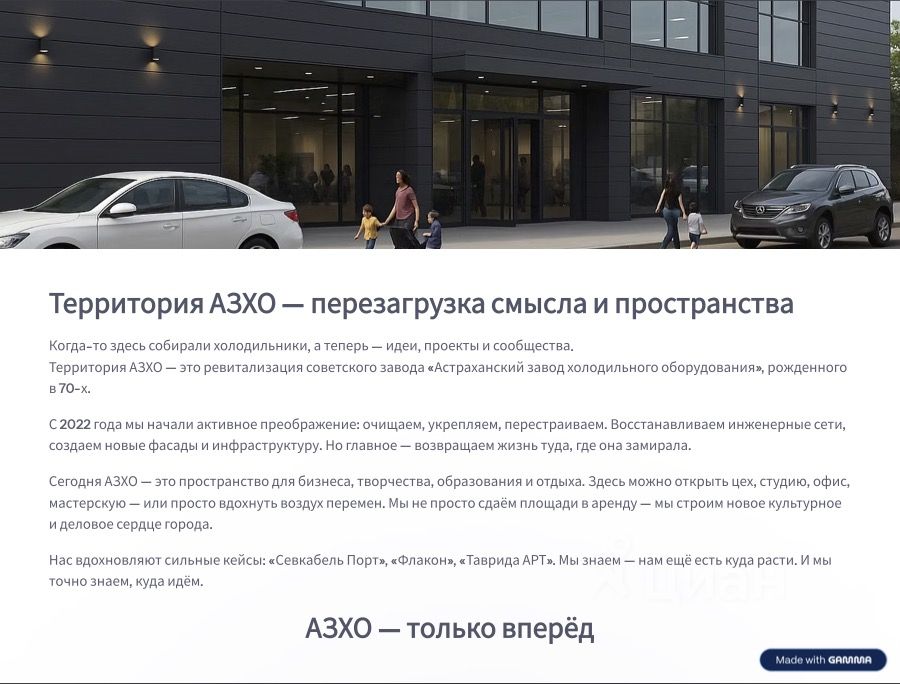 Мы ищем надёжных долгосрочных резидентов, готовых расти вместе с нами. Добро пожаловать на Территорию АЗХО — здесь бизнесу удобно, а людям приятно приходить.