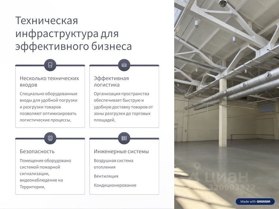 Преимущества помещения: свободная планировка и возможность зонирования под ваши задачи, панорамные окна и световые фонари — максимум естественного света, несколько технических входов для удобной логистики, только первый этаж, удобный вход, отличная видимость фасада.