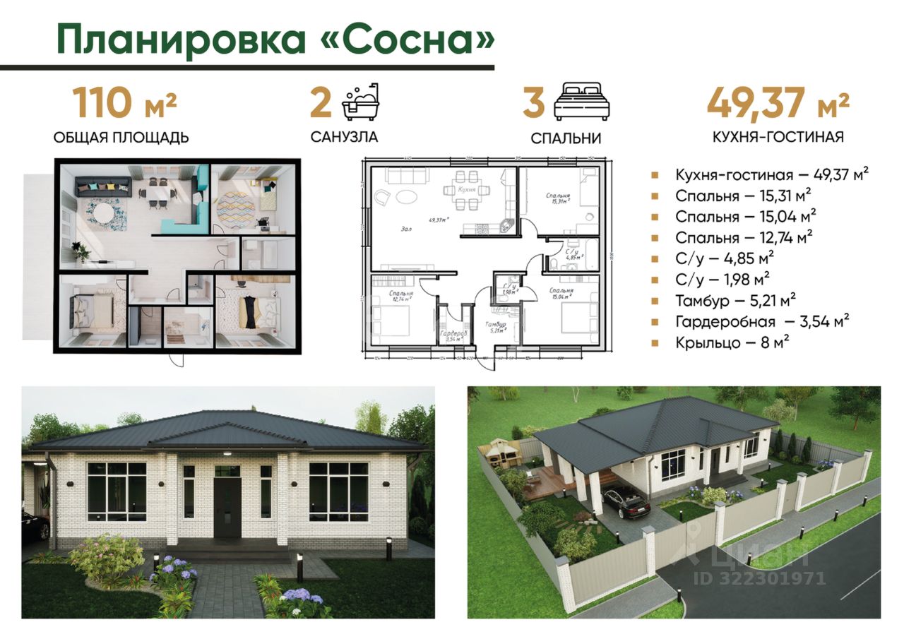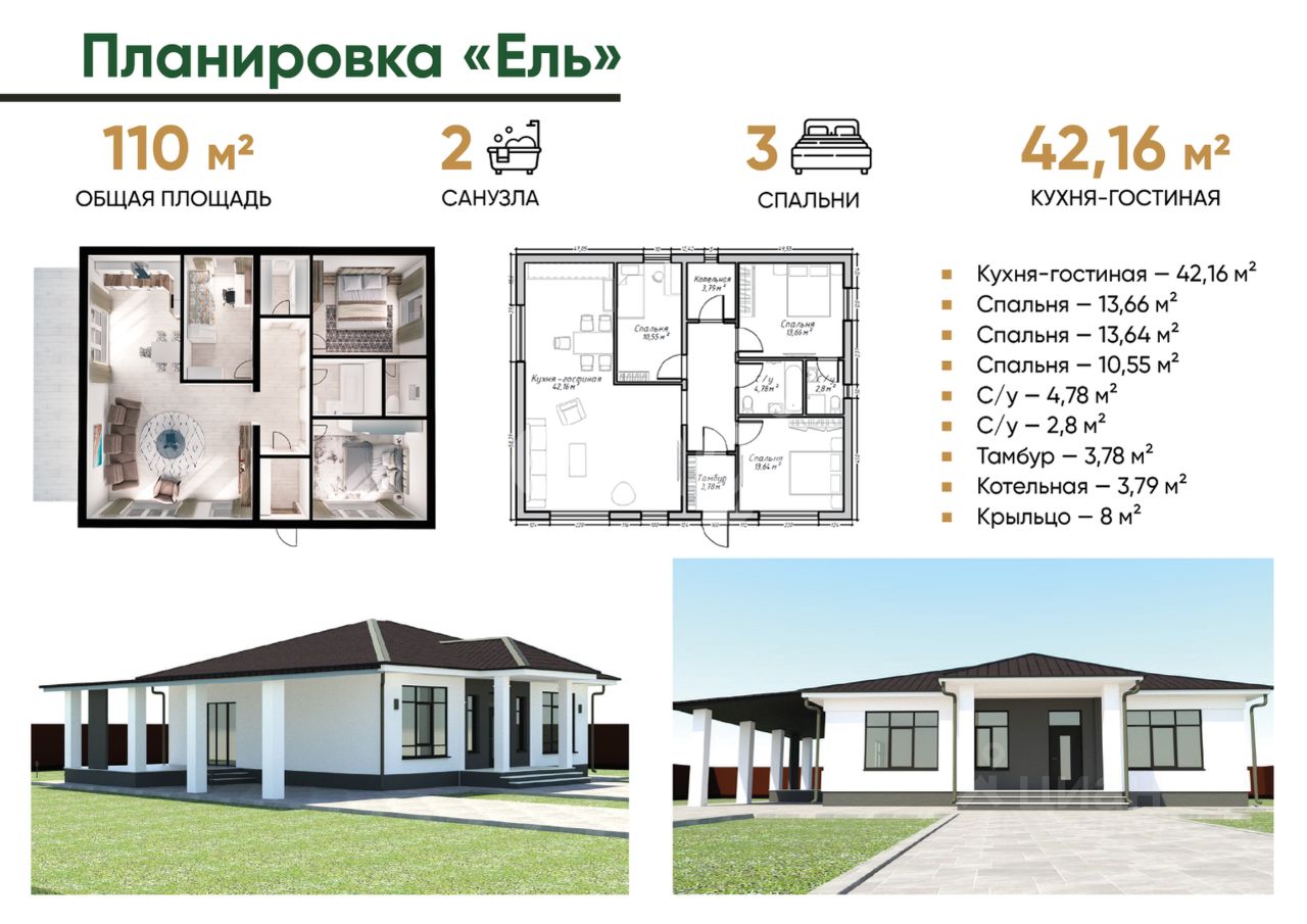 Планировка рассчитана на комфортное проживание: просторная кухня-гостиная, три спальни (включая мастер-спальню), два санузла и коридор. Большие окна обеспечивают естественное освещение, создавая светлое и уютное пространство. Коммуникации полностью подведены: электричество, вода, газ, выгребная яма на два кольца.
