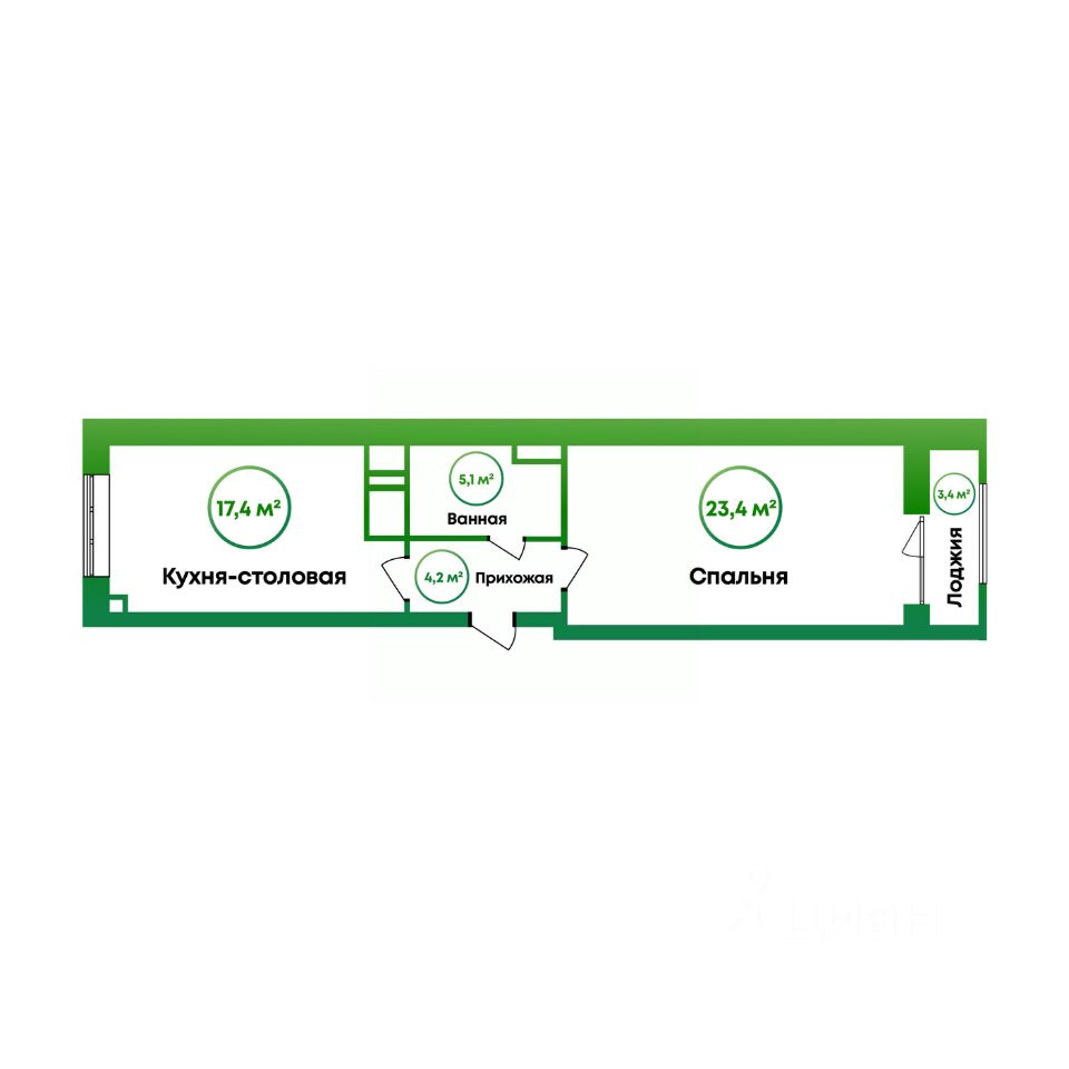 Жилая площадь составляет 23,4 м². Есть выход на просторную лоджию площадью 3,4 м². Её вы можете оборудовать как рабочий кабинет или пространство для отдыха.
