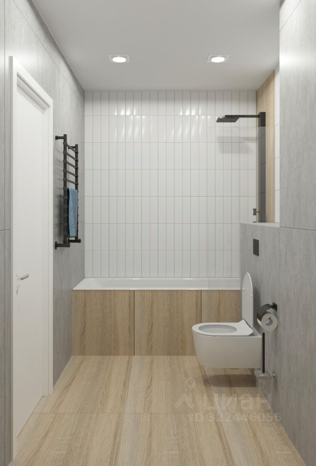 Просторный совмещенный санузел площадью 5,1 м² позволяет уместить необходимую сантехнику и стиральную машину.