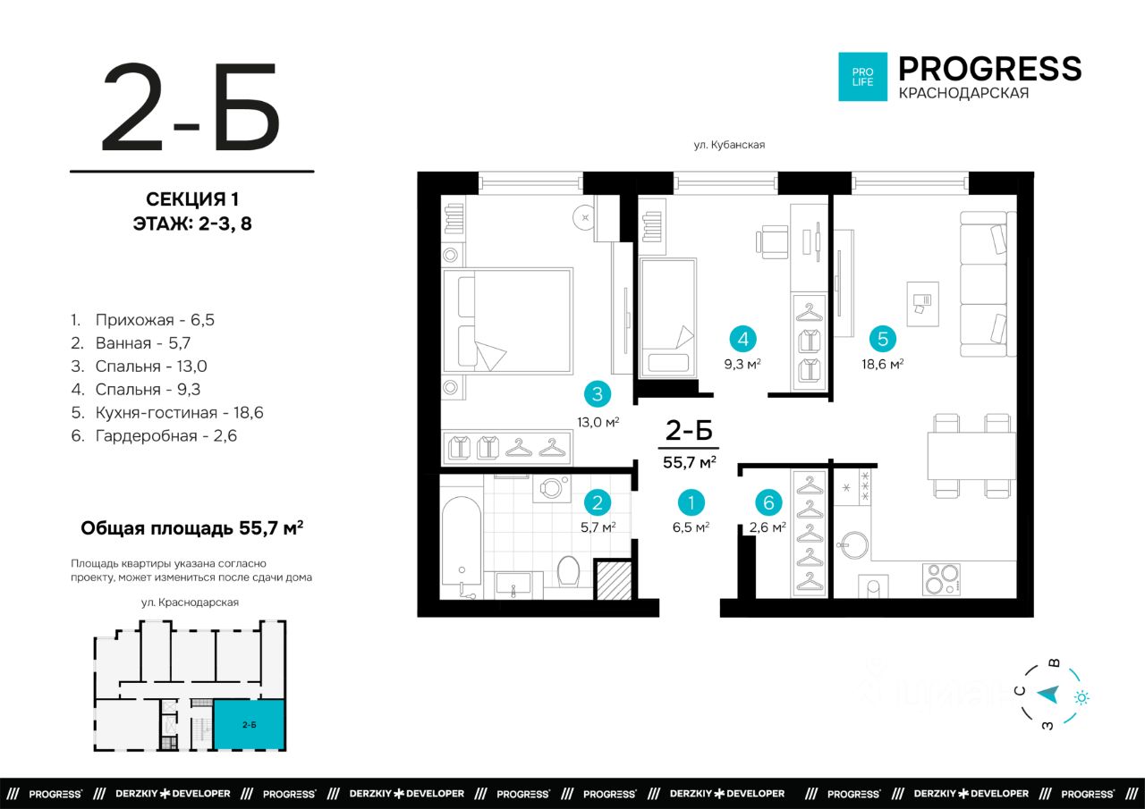 Продаётся 2-комнатная квартира в строящемся доме (Дом 1), срок сдачи: I-кв. 2028, общей площадью 55.73 кв.м., на 2 этаже. Новый жилой комплекс ''Точка'' от застройщика ''Будущее'' расположен по адресу: г. Астрахань, ул. Краснодарской, 43а