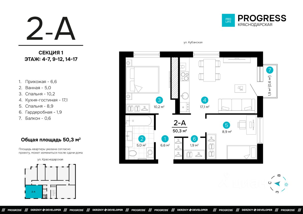 Продаётся 2-комнатная квартира в строящемся доме (Дом 1), срок сдачи: I-кв. 2028, общей площадью 50.3 кв.м., на 7 этаже. Новый жилой комплекс ''Точка'' от застройщика ''Будущее'' расположен по адресу: г. Астрахань, ул. Краснодарской, 43а