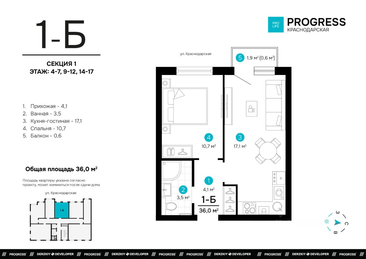 Продаётся 1-комнатная квартира в строящемся доме (Дом 1), срок сдачи: I-кв. 2028, общей площадью 35.96 кв.м., на 7 этаже. Новый жилой комплекс ''Точка'' от застройщика ''Будущее'' расположен по адресу: г. Астрахань, ул. Краснодарской, 43а
