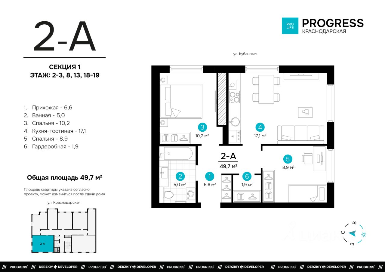 Продаётся 2-комнатная квартира в строящемся доме (Дом 1), срок сдачи: I-кв. 2028, общей площадью 49.72 кв.м., на 8 этаже. Новый жилой комплекс ''Точка'' от застройщика ''Будущее'' расположен по адресу: г. Астрахань, ул. Краснодарской, 43а