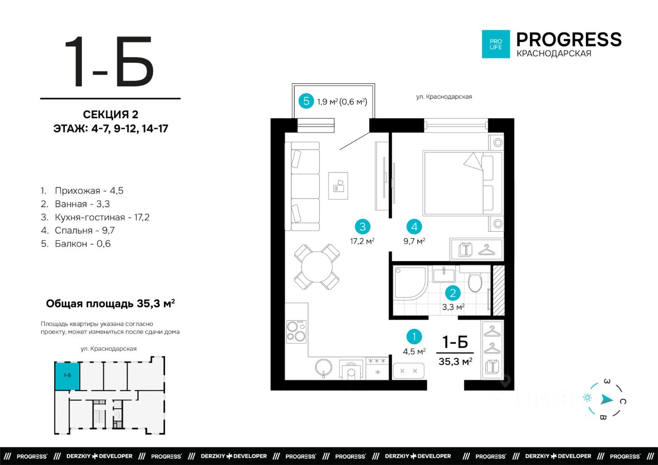 Продаётся 1-комнатная квартира в строящемся доме (Дом 1), срок сдачи: I-кв. 2028, общей площадью 35.29 кв.м., на 9 этаже. Новый жилой комплекс ''Точка'' от застройщика ''Будущее'' расположен по адресу: г. Астрахань, ул. Краснодарской, 43а