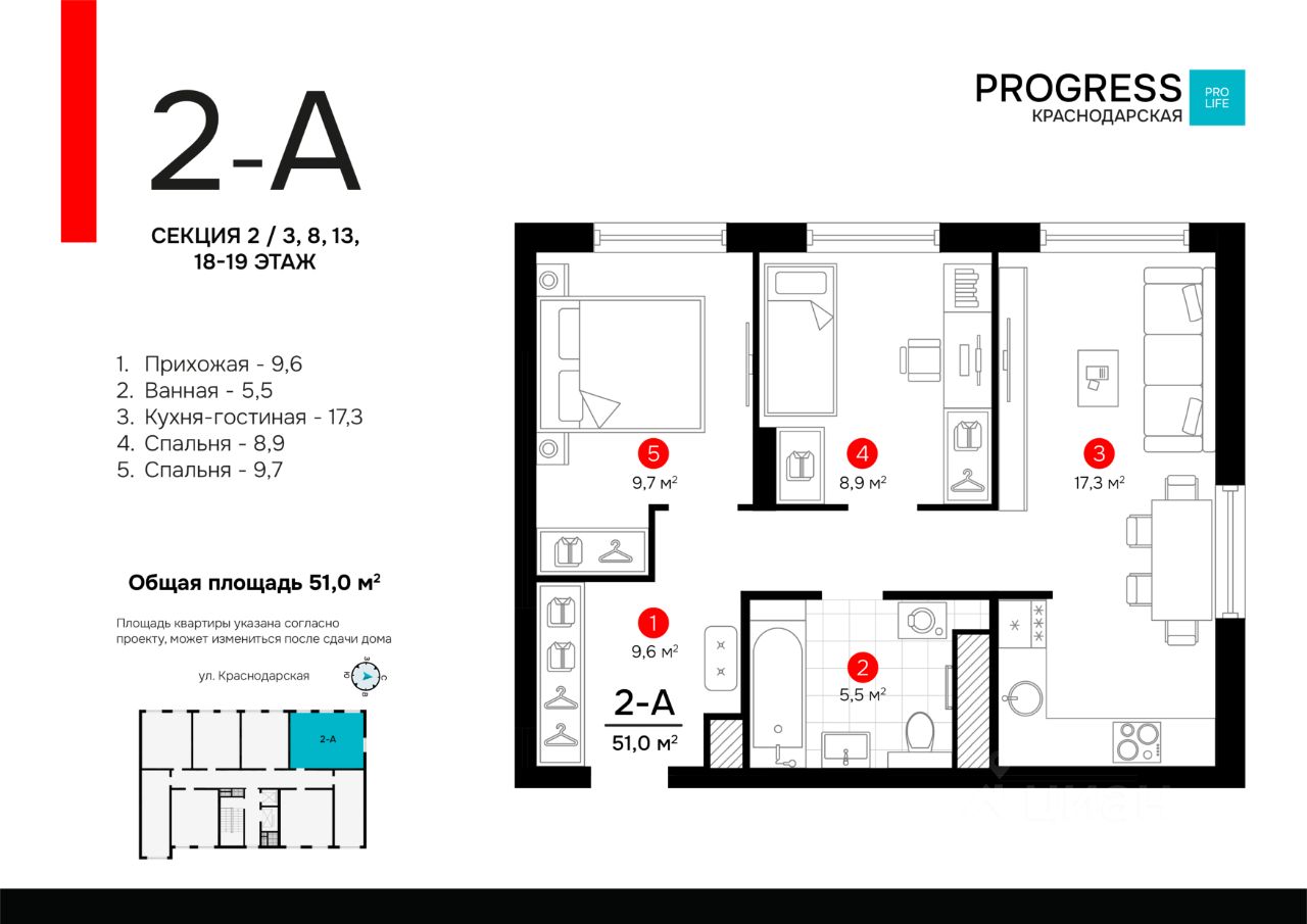 Продаётся 2-комнатная квартира в строящемся доме (Дом 1), срок сдачи: I-кв. 2028, общей площадью 51.05 кв.м., на 18 этаже. Новый жилой комплекс ''Точка'' от застройщика ''Будущее'' расположен по адресу: г. Астрахань, ул. Краснодарской, 43а