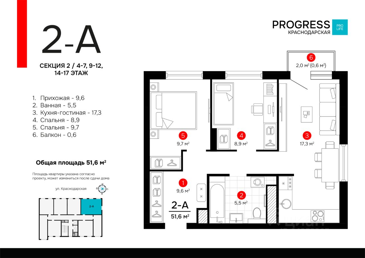 Продаётся 2-комнатная квартира в строящемся доме (Дом 1), срок сдачи: I-кв. 2028, общей площадью 51.64 кв.м., на 17 этаже. Новый жилой комплекс ''Точка'' от застройщика ''Будущее'' расположен по адресу: г. Астрахань, ул. Краснодарской, 43а