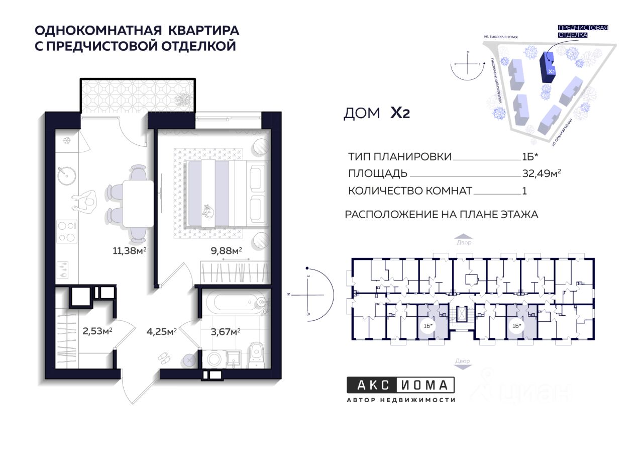 Продаётся 1-комнатная квартира в строящемся доме (Дом 2), срок сдачи: I-кв. 2026, общей площадью 32.49 кв.м., на 5 этаже. Аксиома на Тихореченской