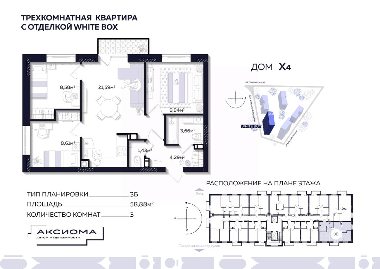 Продаётся 3-комнатная квартира в строящемся доме (Дом 4), срок сдачи: II-кв. 2027, общей площадью 58.88 кв.м., на 5 этаже. Аксиома на Тихореченской