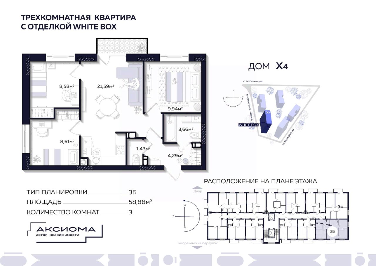 Продаётся 3-комнатная квартира в строящемся доме (Дом 4), срок сдачи: II-кв. 2027, общей площадью 58.88 кв.м., на 3 этаже. Аксиома на Тихореченской