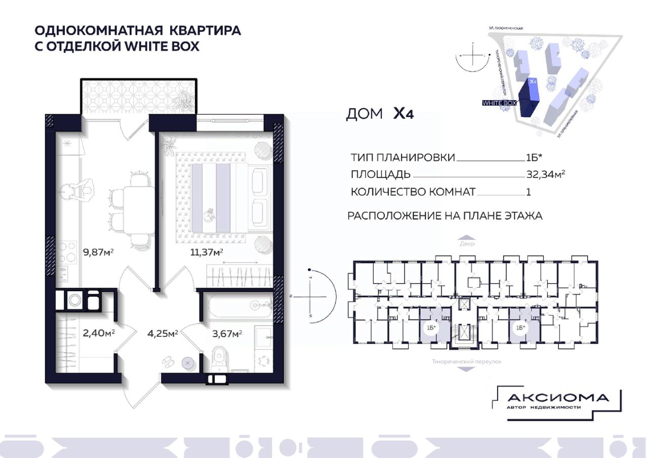 Продаётся 1-комнатная квартира в строящемся доме (Дом 4), срок сдачи: II-кв. 2027, общей площадью 32.34 кв.м., на 7 этаже. Аксиома на Тихореченской