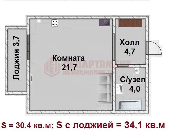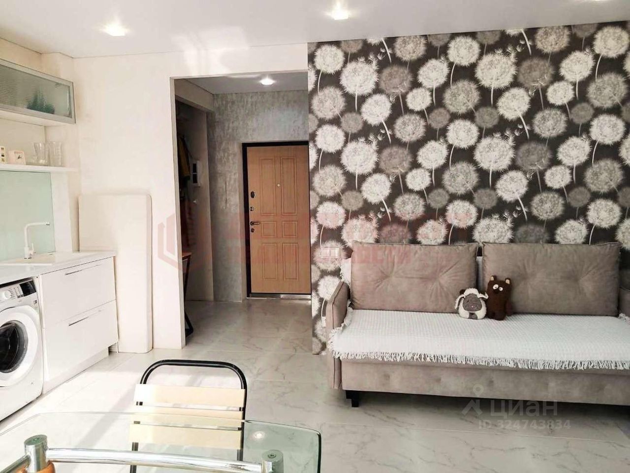 Студия зонирована на входную, кухонную и жилую зоны.