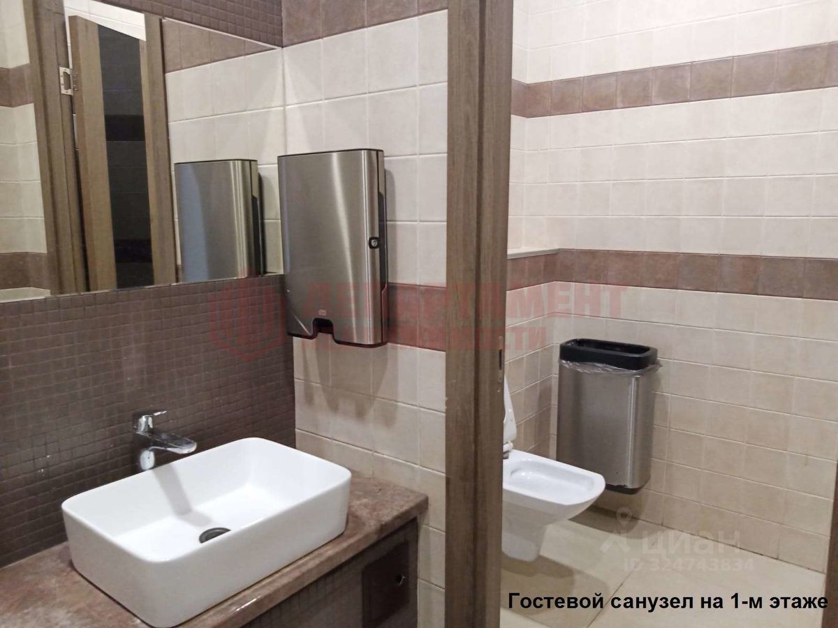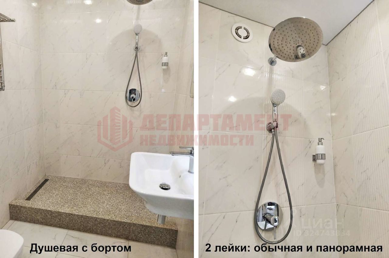 Ванная комната из холла через складную дверь. Просторно. Всё в плитке. Душевой поддон с направленным сливом. Бортик по щиколотку. Две лейки душа: обычная и панорамная. Над раковиной сенсорное зеркало с подсветкой. Унитаз - инсталяция. Сантехника фирмы ''ROCA''.
