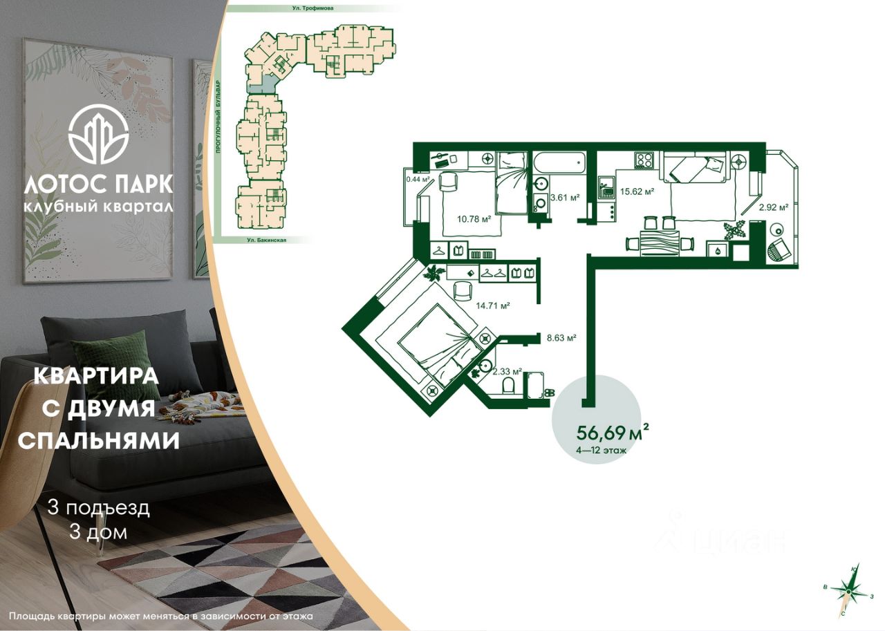Продаётся 2-комнатная квартира в строящемся доме (Дом 2), срок сдачи: I-кв. 2026, общей площадью 56.69 кв.м., на 4 этаже.