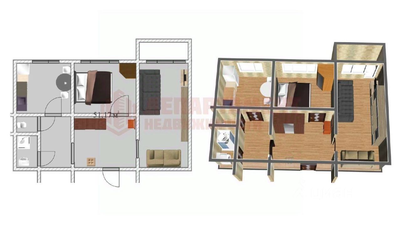 * Общая площадь квартиры: 49,3 кв. м., с учетом балкона - 51,7 кв.м