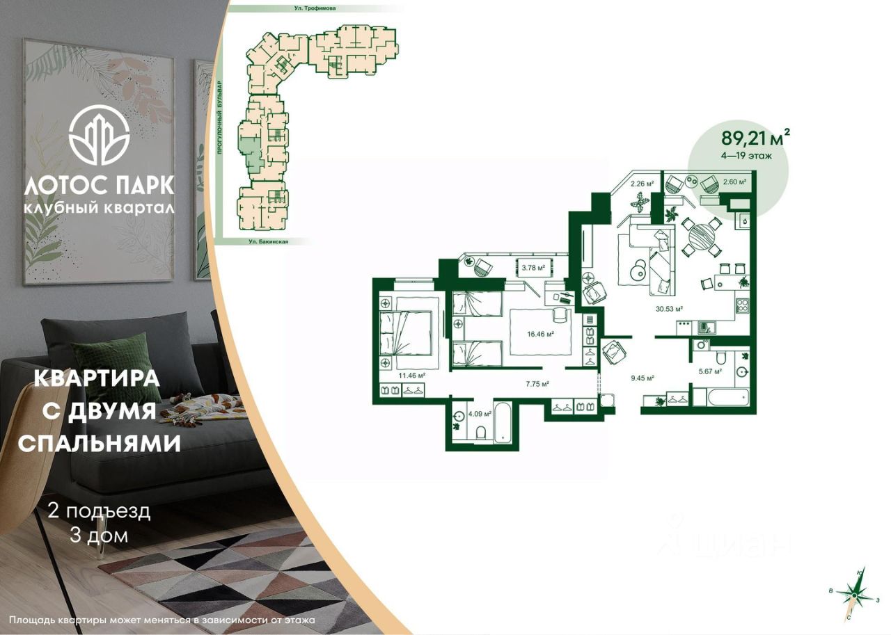 Продаётся 2-комнатная квартира в строящемся доме (Дом 2), срок сдачи: I-кв. 2026, общей площадью 89.21 кв.м., на 12 этаже.