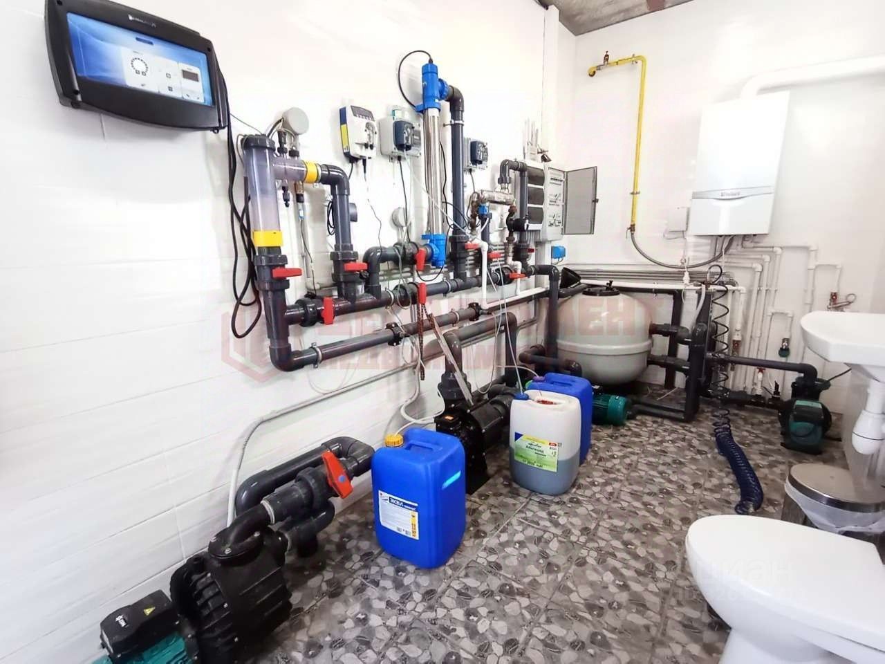 БАННЫЙ КОМПЛЕКС: Коробка выстроена - перекрытие монолитное. Установлен действующий композитный БАССЕЙН с системой газового подогрева (можно использовать круглый год).Чаша бассейна дополнительно утеплена. Бассейн оснащен аттракционами. Общий объем воды - 41 куб. Под БАННЫЙ КОМПЛЕКС предусмотрена своя КОТЕЛЬНАЯ, система очистки воды, насосы. Санузел с теплыми полами. В здании предусмотрен проводной интернет, роутер и три фазы электричества.