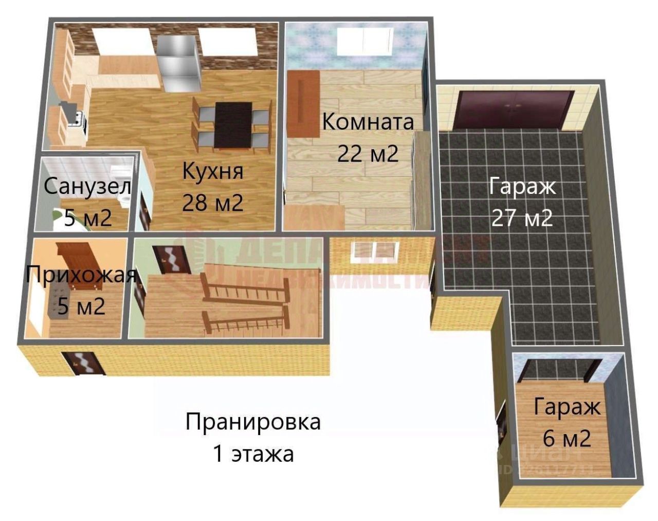 ПЕРВЫЙ ЭТАЖ: просторная кухня с - 28 м.кв., комната - 22 м.кв., коридор и прихожая- 5,2 м.кв., санузел совмещенный (большая ванна '' Джакузи'' с массажным эффектом) - 5 м.кв.