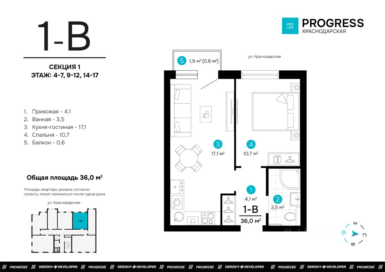 Продаётся 1-комнатная квартира в строящемся доме (Дом 1), срок сдачи: I-кв. 2028, общей площадью 35.96 кв.м., на 4 этаже. Новый жилой комплекс ''Точка'' от застройщика ''Будущее'' расположен по адресу: г. Астрахань, ул. Краснодарской, 43а